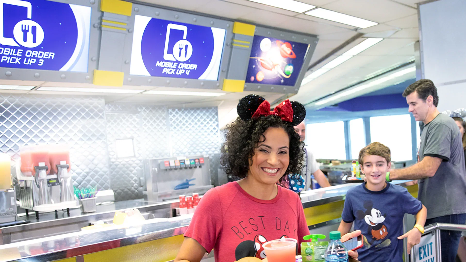 A family leaving the mobile order pickup counter with their food