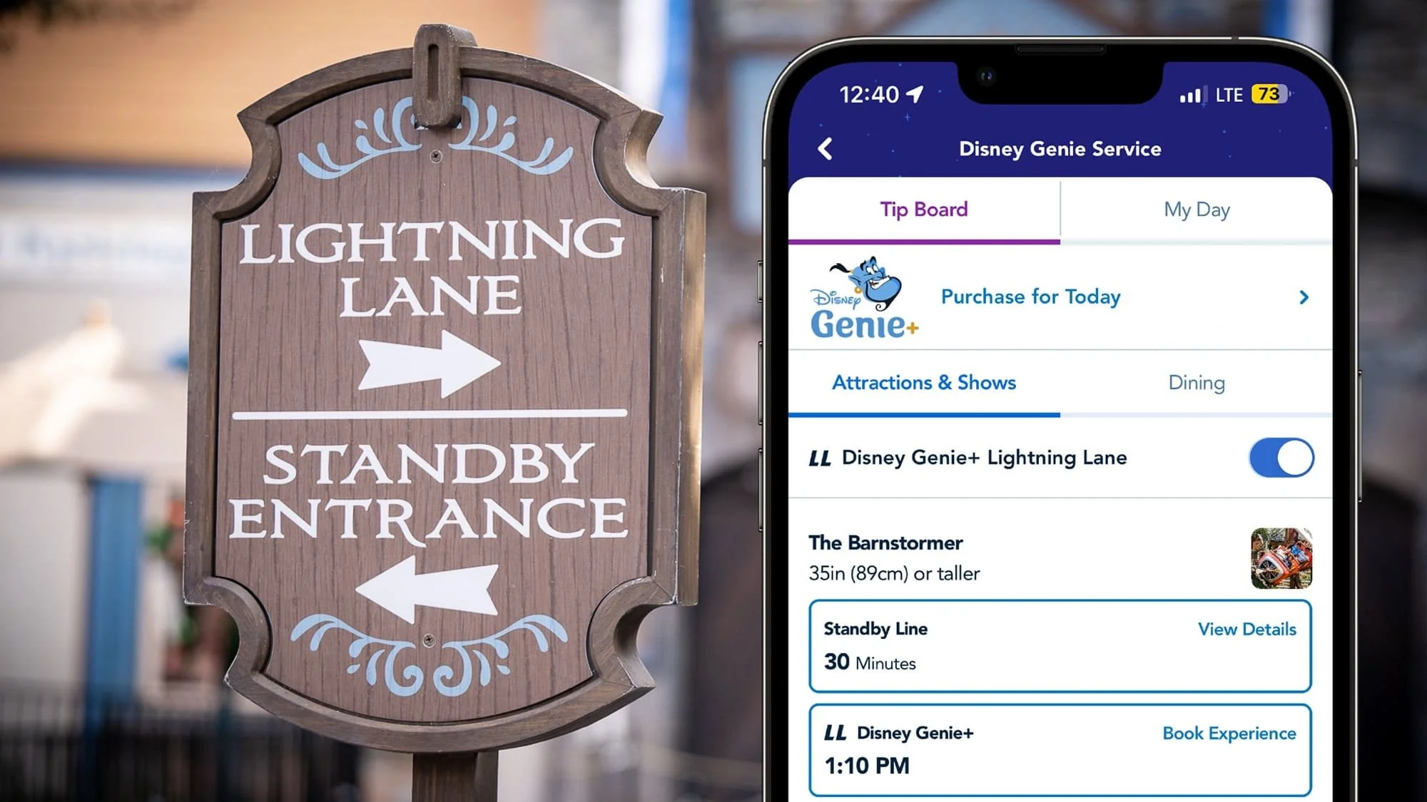 A smartphone showing the Lightning Lane service next to a Lightning Lane sign