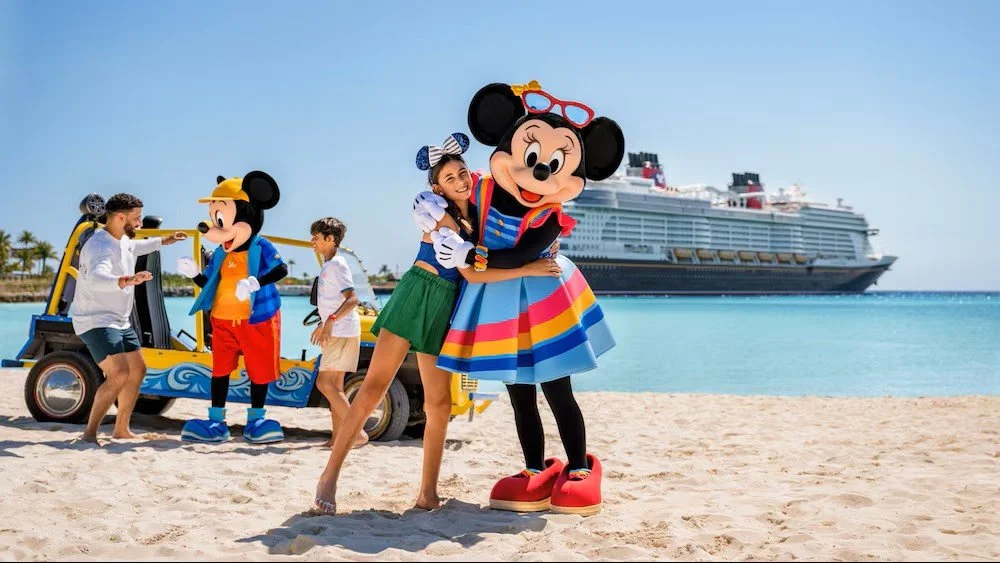 A girl hugging Minnie Mouse with her family in the background talking to Mickey Mouse and a cruise ship in the background