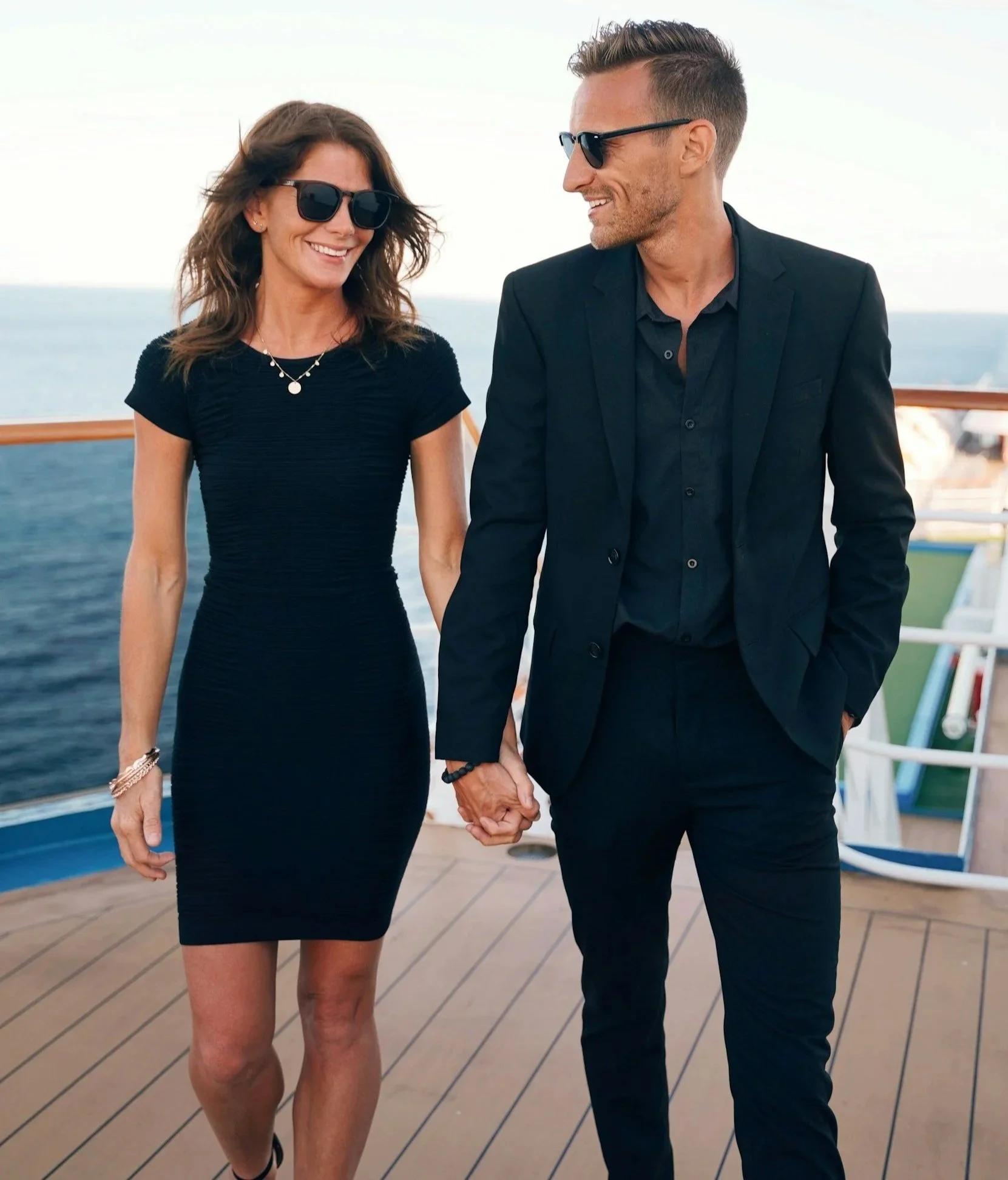A couple dressed in formal attire on the outside deck of a cruise ship